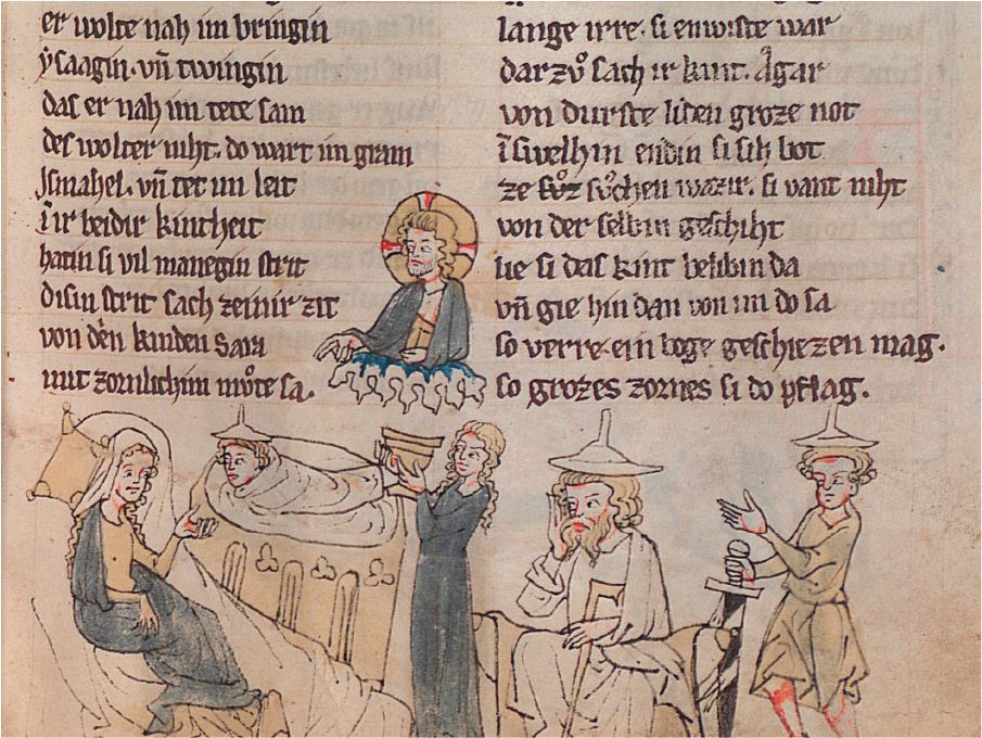 I.1.3. Пополнение в семье Авраама и Сарры. Их новорожденный сын Исаак, который лежит в колыбели, как и отец, изображен в юденхуте, ведь он тоже еврей. В аналогичном духе короли на средневековых изображениях часто спят в коронах. Эта деталь показывала зрителю, кто они, но он явно понимал, что на самом деле монархи отходят ко сну без корон, что это всего лишь знак их статуса. На этой миниатюре таким же знаком служит юденхут, в который одевают даже младенца.