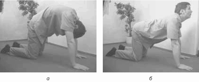9. Упражнение «кошка-собака». Исходное положение – в упоре на прямых руках, стоя на коленях, руки и ноги на ширине плеч. С вдохом выгнуть спину, то есть перейти в положение «кошки» (рис. 2.7, а) или «карточного домика», «крыши дома», хорошо прогнуться в плечах (так, чтобы на этом уровне не было перелома прямой по рукам и телу до таза). Голову нагнуть к яремной ямке, живот втянуть. С выдохом перейти в позу «собаки» (рис. 2.7, б), то есть максимально прогнуться всем телом к полу на прямых руках. Голова заведена назад. Переход «кошка-собака» начинается с головы и заканчивается движением по дуге.