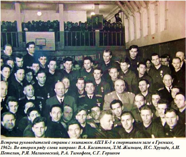 После возвращения в базу руководителю похода, командующему 1-й флотилией подводных лодок Северного флота контр-адмиралу А.И. Петелину, командиру корабля кап. 2 ранга Л.М. Жильцову и командиру БЧ-5 (электромеханической боевой части) инженер-кап. 2 ранга Р.А. Тимофееву были присвоены звания Героя Советского Союза. Весь личный состав корабля и ряд специалистов промышленности были награждён орденами и медалями: орденом Ленина – 11 человек (кроме Героев); орденом Красного Знамени – 19 человек; орденом Красной Звезды – 28 человек; медалью За отвагу – 63 человека. Двум боевым сменам экипажа награды вручал сам Первый секретарь ЦК КПСС, Председатель Совета министров СССР Н.С. Хрущёв в спортивном зале 14-й бригады подводных лодок в Йоканьге. Одна смена в это время обеспечивала функционирование подводной лодки в базе. Личному составу этой смены позже вручил награды секретарь Мурманского обкома КПСС. Думаем, что представленная здесь фотография об этом событии ярко передаёт чувства всех, кто творил ту историю.