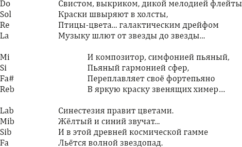 10. Mi бемоль (жёлтый квадрат)Жёлтый и синий звучат…Пенятся на палитре!Музыку слышит взгляд,Ловит стихи-субтитры.В синтезе всех искусств,В танце цивилизацийБьётся аллегро чувствВ диком балете граций…Синтез пространств, времён…Синтез каналов в пране!Синтез… как жёлтый громВ этой древней космической гамме.11. Si бемоль (лимонный пентагон)И в этой древней космической гамме Светится дирижёр…Выдохом, палочкой, телом, руками Он направляет хор.Каждый оркестр, и мир, и жизнь — Соло его руки…И строки гимнов, и пляска тризн — Капли одной реки…Тает серебряных звуков ртуть.Бьёт барабаном радостный град!Жёлтой штриховкой на Млечный путьЛьётся волной звёздный пад.12. Fa (жёлто-зелёный секстагон)Льётся волной звездопад.Водят балет планеты.Пифагорейский ряд[22]Строгие ставит меты.Чистый, как воздух, строй:Восемь девятых – тон…Слышишь там… под горойПервый грохочет гром…Кто мы? Откуда взялись?С кем ты? Зачем здесь? И чей ты?Вьются вопросы ввысьСвистом, выкриком, дикой мелодией флейты…0. Полный круг (додеканическая радуга)