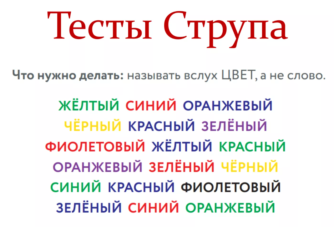 Тест СтрупаТест струпа проверит вашу способность к синхронизации правого и левого полушария мозга для решения проблемы связанной с задачей концентрироваться. При прохождении этого теста вам нужно будет обращать внимание не на написание слова (название цвета), а на его настоящий цвет, произнеся вслух цвет которым это слово написано.