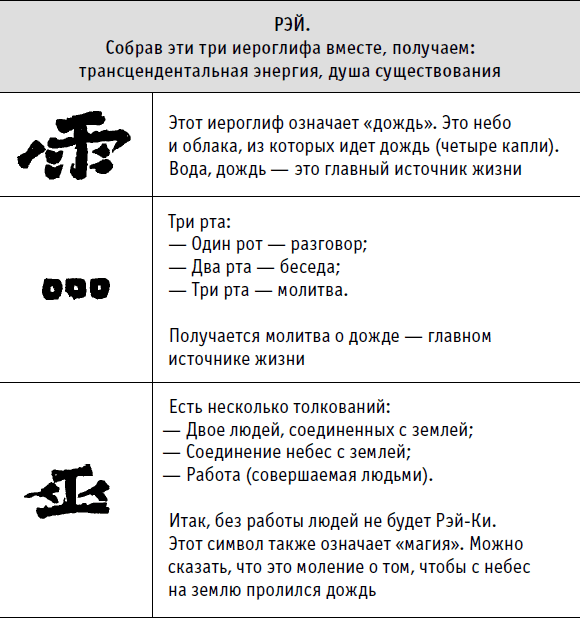 Чтобы получить более тонкое толкование понятия Рэй-Ки (его приводит Фоке Бринк в «Reiki magazine international», October-November, 2002), рассмотрим подробно старый иероглиф, предварительно «разобрав» его на части.