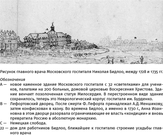 С больницей на 200 коек управлялись всего пять профессиональных медработников: архиатр, т. е. главный врач, – сам Бидлоо, лекарь Андрей Рёпкен, подлекарь, аптекарь, подаптекарь. Роль подмастерьев выполняли 50 учеников: госпиталь изначально задумывался как клинический.