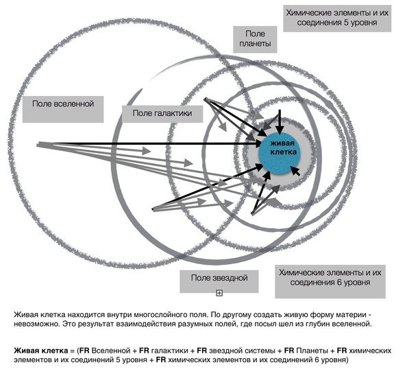 Рождение живой формы материи было обеспечено механизмом взаимодействием разумных полей, начиная от разумного поля вселенной, галактики, звездной системы, нашей планеты, химических элементов и их соединений пятого и шестого уровня, которые преобразовали поверхность планеты в динамическую среду обитания. С рождением живой формы материи, процессы эволюции интенсифицируются. Живая клетка не может появиться на поверхности планеты сама по себе. Ее рождение было обусловлено механизмом взаимодействия разумных полей, который является ключевым фактором в формирование множества качеств и способностей новой формы материи, которая начала размножаться и развиваться. С рождением живой формы материи, алгоритмы эволюции изменились. В процесс включаются силы разума и силы природы, которые действуют изнутри живой формы материи. И эти силы, судя по всему, желают одного – вернуться к источнику жизни!