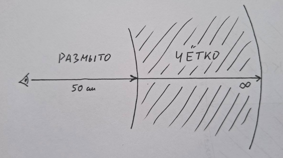 При близорукости он уменьшается со стороны дальней границы и сокращается до, к примеру, 1 метра (при -1 диоптрии). Или до 50 см (при -2 диоптриях). Или до 25 см (при -4 диоптриях).