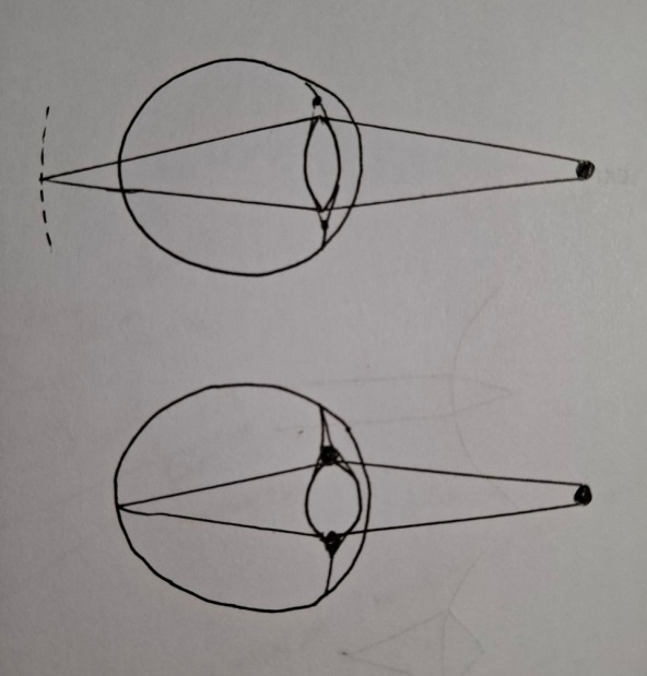 При сокращении мышцы Иванова сила натяжения цинновых связок увеличивается, они растягивают хрусталик, делают его более плоским, от этого его преломляющая сила уменьшается, и он начинает смещать точку фокуса от объекта вдали, дальше от самого себя (то есть точно на сетчатку). И тогда мы видим тоже всё чётко.