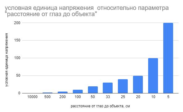 Если мы обозначим степень напряжения мышцы Мюллера “условной единицей”, то если (у вас хорошее зрение) и вы будете смотреть вдаль (на 5м и более) вы будете напрягать цилиарную мышцу на 0 условных единиц. Смотря на 5 метров – напряжение будет на 2 условные единицы (сокращённо у.е.). Смотря на 2 м в телевизор, к примеру, напряжение увеличится до 5 у.е (в 2.5 раза, пока терпимо). Смотря на 1 метр в экран компа, напряжение увеличится до 10 у.е (в 5 раз! уже сложновато). Но вот если вы начинаете смотреть на 50 см и ближе, начинаются серьёзные проблемы. Тут напряжение увеличивается до 20 у.е (то есть в 10 раз больше, чем если бы вы смотрели на 5 метров! Это ОЧЕНЬ МНОГО. Смотря на 33 см (в телефон) вы напрягаете свои глаза на 30 у.е. Смотря на 25 см, напряжение будет в 40 у.е. На 20 см – 50 у.е. На 10 см – 100 у.е. И наконец, на 5 см – 200 у.е (В 100 РАЗ БОЛЬШЕ НАПРЯГА, чем при смотрении на 5 метров).