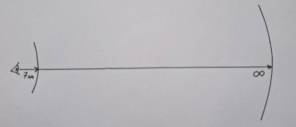Чем на более близком расстоянии мы смотрим, тем на большее число диоптрий надо увеличить оптическую силу глаза, чтобы увидеть там чётко. Для примера, в нормальном глазу, с хорошим 100% зрением, при смотрении вдаль, глаза имеют оптическую силу 0 диоптрий. Свет при этом от дальних объектов падает точно на сетчатку, и они видны чётко.