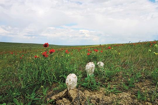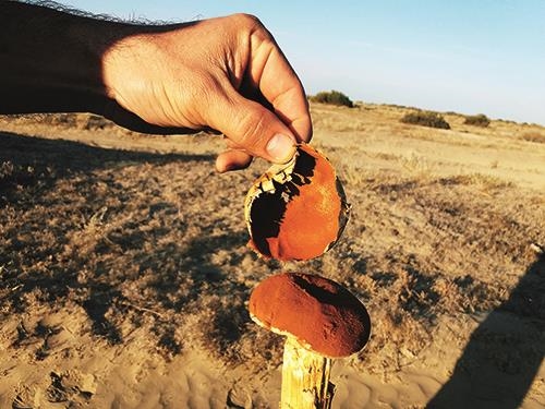 На солончаках есть такыр – знаменитая классическая форма рельефа, когда высыхающая после весеннего разлива или дождей глинистая почва трескается, образуя характерный узор; фотографы обожают такыры. Даже солончаки в плане грибов не остаются совершенно бесплодными. Часто можно увидеть, как их плотную асфальтоподобную растрескивающуюся корку пробивают плодовые тела шампиньона Бернара, белошампиньона румянящегося или баттареи веселковой. Попадаются здесь и всевозможные любители навоза (строфарии, псилоцибе, панэолусы, навозники и проч.), которые осваивают «лепешки» бродящих по солончакам коров. На сырой соленой почве здесь охотно вырастает очаровательный дождевик тарелочница белая.