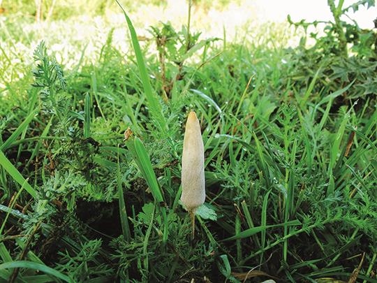 Еще один наш пустынный экзот – подаксис пестичный, растущий только на самом юго-востоке европейской части в песках полупустынь и пустынь; тут уж вам никаких степей. В Западной Африке, например, он плодоносит на вершинах термитников. Это тоже реликт мелового периода, первые отпечатки подаксиса датируются 130 млн лет до н. э. Он очень похож на задубевший на жаре белый навозник – такой же яйцевидный или продолговато-яйцевидный, чешуйчатый. Высота гриба может достигать 20 см, но обычно он несколько ниже. Срез вас удивит: он практически сплошной с небольшой вертикальной полостью (остатки эволюционно «спрятавшейся» ножки), совсем не та картина, которую вы инстинктивно ждете как при разрезании навозника. Ножка в основании переходит в вольву-клубень, сформированную во многом за счет захваченного грибом песка. Подаксис плодоносит только в мае – июне после дождей, часто одновременно с маками. Пока он молодой и мягкий, его можно есть, но (см. выше) – жалко.