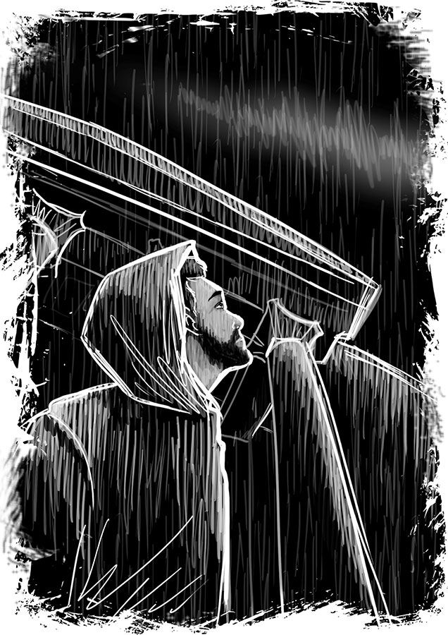 Выхожу на улицу. Слышу дождь. Выставляю руку, но капли практически не касаются кожи. Провожу ладонями по лицу. У меня борода. За холмом раздается гром, а затем желтые молнии прочерчивают небо.