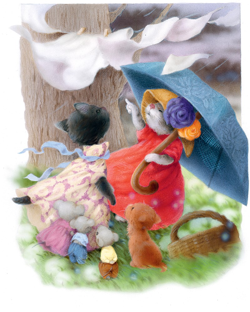 Кошечки и мышки сначала очень удивились и даже слегка испугались, но потом, разглядев под зонтиком Мусю, успокоились и окружили зонтик, чтобы послушать его, то есть Мусины, слова.