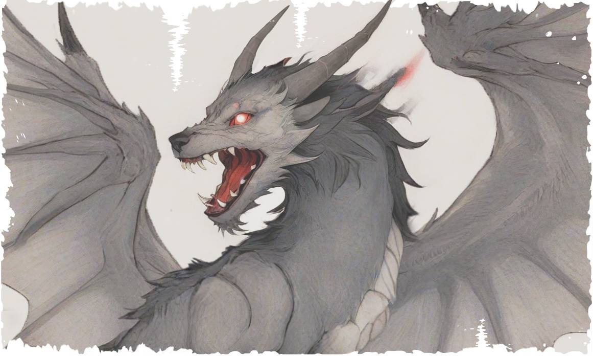 Существо медленно сложило крылья, и на небе сверкнули молнии, освещая зверя. По размеру оно немного превосходило лошадь. Серебристая шерсть, покрывающая тело, будто состояла из металлических ворсинок. У зверя была широкая грудь, мощные лапы с острыми когтями, длинная шея. Крепкий хвост обвивал корпус. Голова, похожая на волчью, увенчивалась длинными изогнутыми рогами. Глаза светились алым пламенем. Нос сейчас был сморщен и вздёрнут, обнажая острые спицы-зубы в оскале. Из пасти доносился тихий злобный рык.