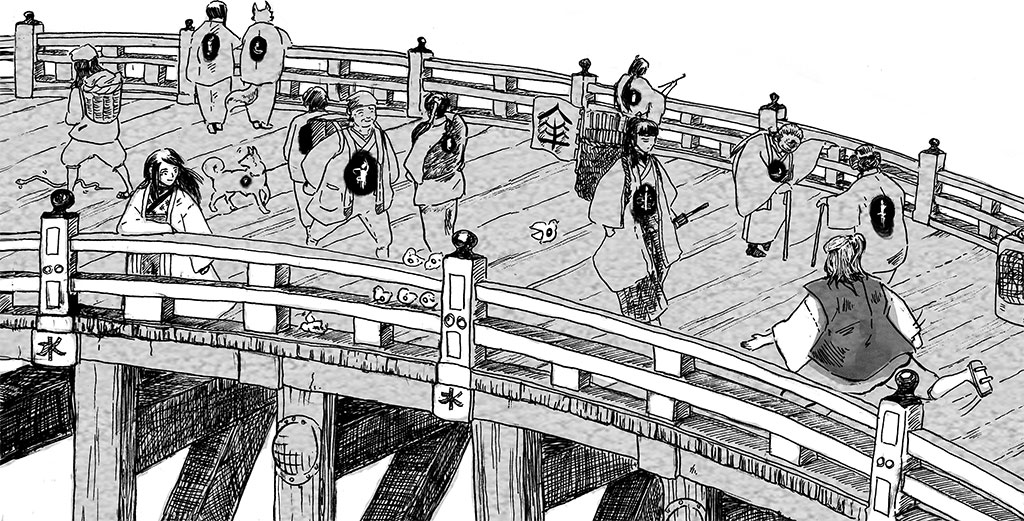Буру-тян, безголовая лошадь, вдруг затопала ногами, привлекая внимание собравшихся к ступившей на мост пожилой женщине из театра.