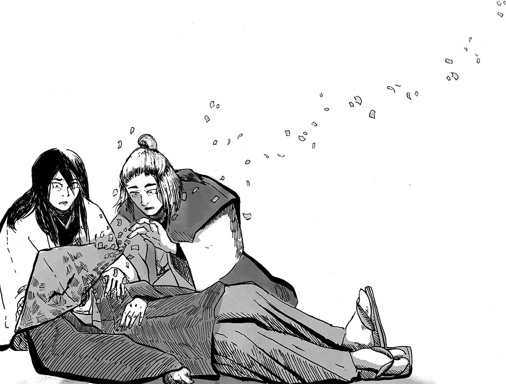Хайо накрыла глаза Дзуна шелковым отрезом и завязала концы. Самую неприглядную часть проклятия удалось закрыть. Оно выглядело отвратительно; после подобного зрелища люди часто забывают личность и запоминают только ее смерть. Этого никто не заслуживает. Человек должен значить больше, чем обстоятельства собственной смерти.