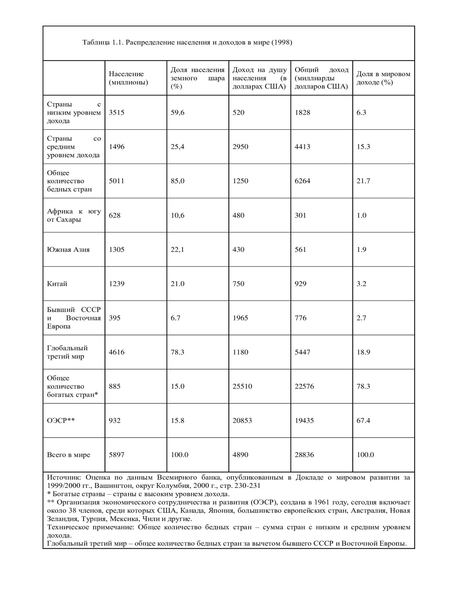 В основе глобальной экономической системы лежит неравноправная структура торговли, производства и кредитования, которая определяет роль и положение развивающихся стран в мировой экономике. Какова природа этой развивающейся мировой экономической системы; на какой структуре глобальной бедности и неравенства доходов она основана? В XXI в. население земли превысит 6 миллиардов человек, из которых подавляющее большинство будут жить в относительно небогатых странах. В то время как богатые страны (с населением около 15 % от мирового населения) контролируют около 80 % общего мирового дохода, примерно 60 % мирового населения, представляют группу «стран с низким уровнем дохода» (включая Индию и Китай). Эти страны с населением свыше 3,5 миллиардов человек получают 6,3 % от общего мирового дохода (меньше, чем ВВП Франции и ее заморских территорий). При населении более 600 миллионов человек валовый внутренний продукт всего африканского региона к югу от Сахары примерно вдвое меньше, чем в штате Техас. В совокупности страны с низким и средним уровнем дохода (включая бывшие «социалистические» страны и бывший Советский Союз), на долю которых приходится около 85 % мирового населения, получают примерно 20 % от общего мирового дохода (см. таблицу 1.1.)