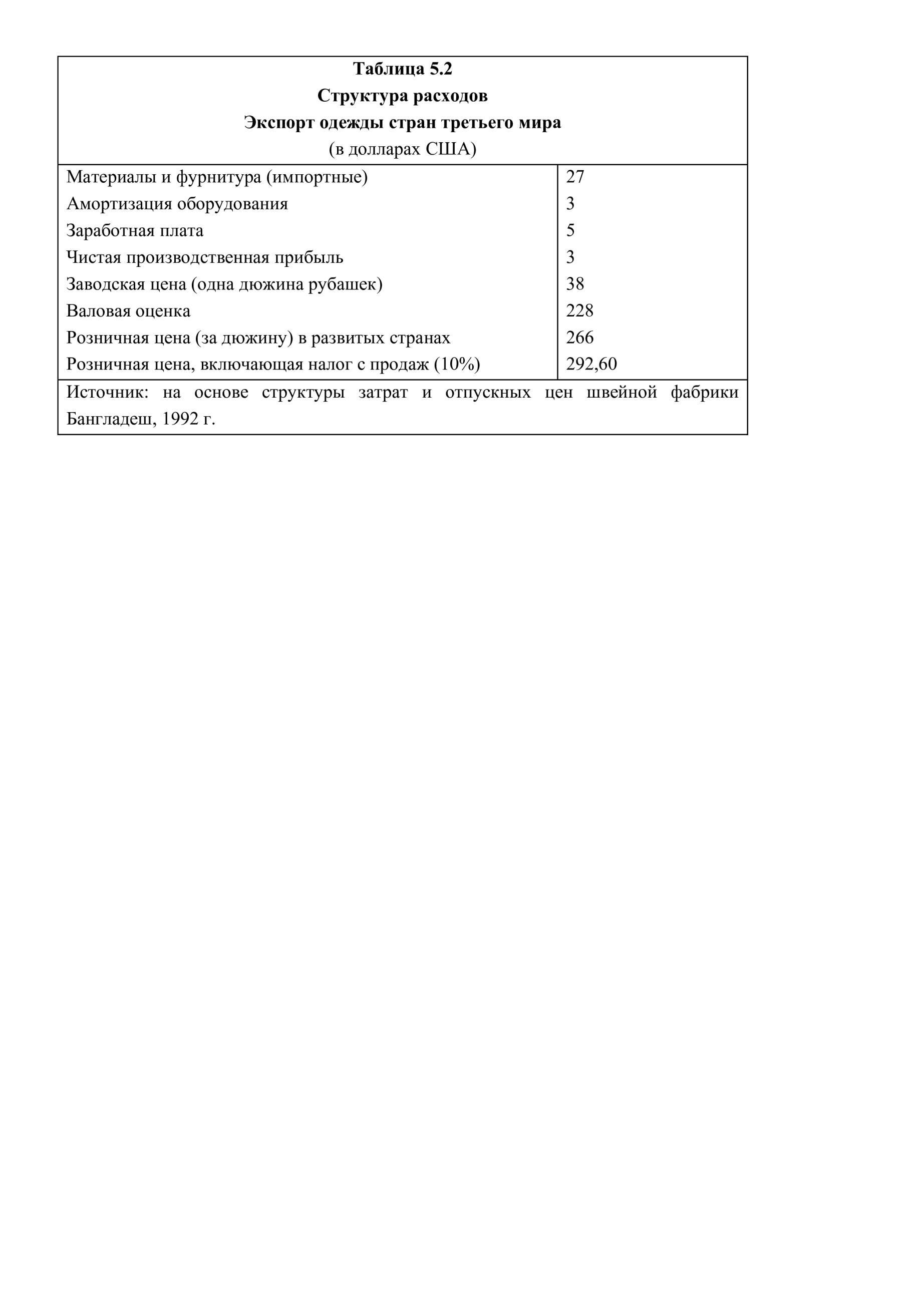 В международной швейной торговле, например, международный дизайнер моды приобретет рубашку, разработанную в Париже, за 3–4 доллара в Бангладеш, Вьетнаме или Таиланде59. Затем изделие перепродается на европейском рынке в пять-десять раз дороже первоначальной цены. Таким образом валовой внутренний продукт импортирующей западной страны увеличится без осуществления реального производства. Данные, собранные на фабриках в Бангладеш, помогают нам определить структуру затрат и распределение доходов в швейной отрасли: фабрика продает дюжину рубашек по цене от 36 до 40 долларов США (FOB)60. Все оборудование и сырье импортируется. Рубашки продаются в США по цене около 22 доллара за штуку или 266 долларов за дюжину (см. таблицу 5.2). Женская и детская рабочая сила в бангладэшских швейных мастерских получает небольшую долю от общей стоимости товара. Менее двух процентов от общей стоимости товара идет на заработную плату швейникам в странах первого мира. Примерно один процент возвращается в виде промышленной прибыли независимому производителю из стран третьего мира.