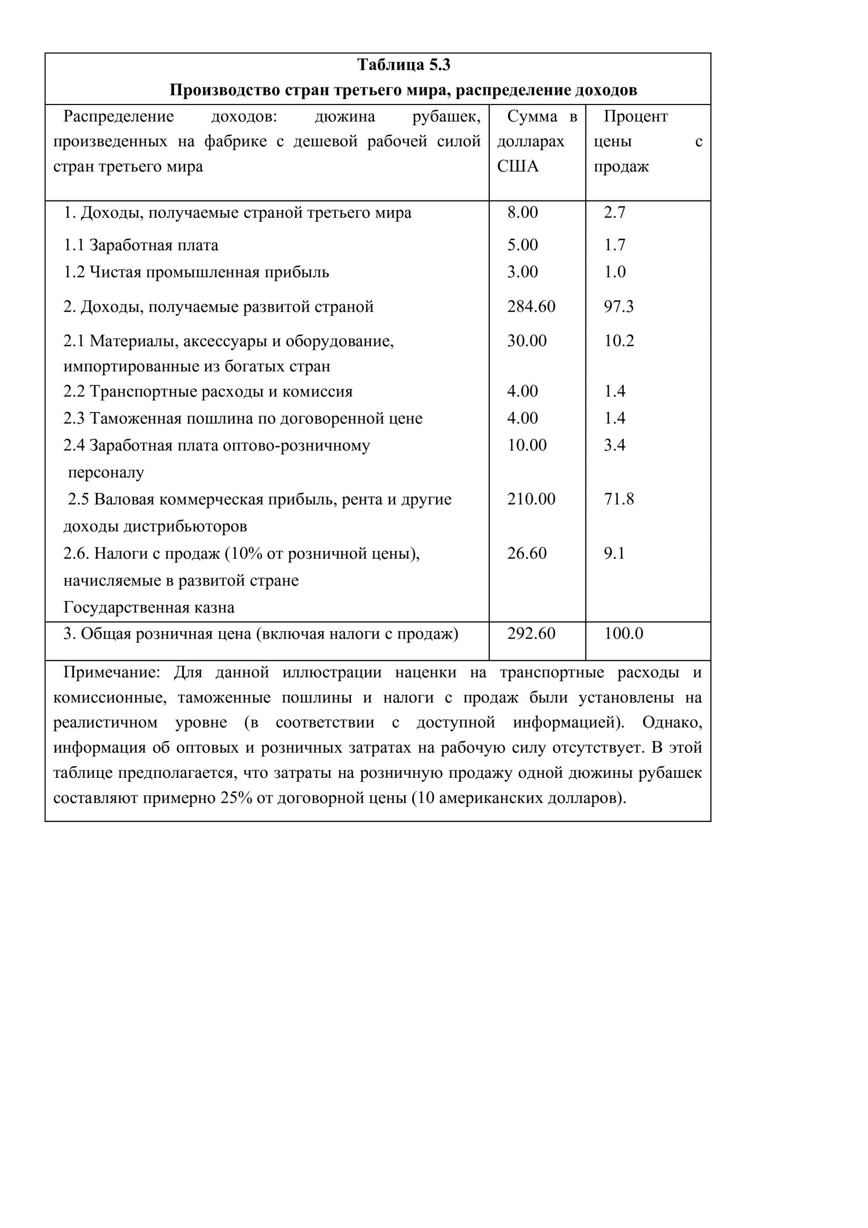 Важно подчеркнуть, что поток импорта из стран третьего мира также служит источником налоговых поступлений для государственных бюджетов развитых стран в виде налогов на продажу и НДС, которые превышают 10 % от розничной цены в Западной Европе. Процесс сбора налогов, таким образом, зависит от структуры неравного обмена товарами. В примере швейной промышленности, казначства развитых стран получают почти столько же, сколько и сама производящая страна, и примерно в четыре раза больше, чем получают швеи в производящей стране (см. таблицу 5.3).