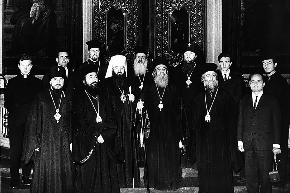 Митрополит Ленинградский Никодим (Ротов) (третий слева в первом ряду) с делегацией Иерусалимского Патриархата во главе с Патриархом Венедиктом. Крайний слева во втором ряду – иподиакон Владимир Гундяев. 1960-е гг.