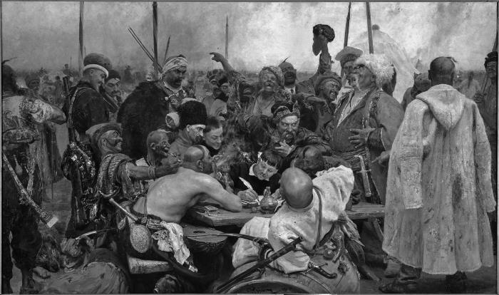 Рис. 1. И. Е. Репин. «Запорожцы пишут письмо турецкому султану», 1880–1891. Холст, масло. 203x358 см. Государственный Русский музей, Санкт-Петербург