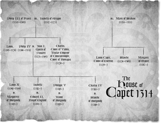 All the above are historical names, as are those of the barons, justiciars, chamberlains, members of the Council, chancellors, the Abbot of Saint-Denis and the great officers of the Crown; all these people really existed. The only imaginary names are those of a few extras, of whom no trace can be found, such as Robert of Artois’s servant and the Provost of Montfort-I’Amaury.