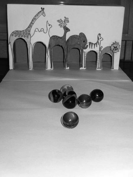 Что нужно? Для игры необходимо подготовить большие круглые шарики марблс, нарисовать животных и приклеить их к любой коробке, можно из-под обуви.
