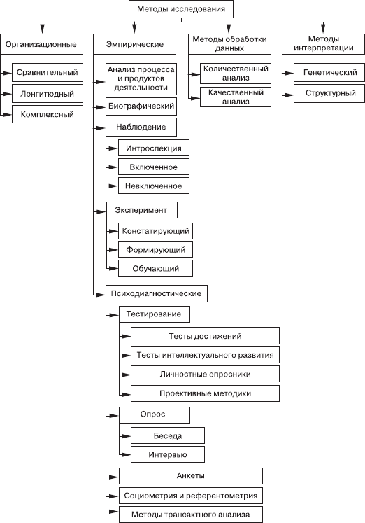 Организационные методы: сравнительный, лонгитюдный, комплексный. Эмпирические методы: виды наблюдения, эксперимент, психодиагностические методы (тесты, опросники, анкеты, беседа, интервью), анализ продуктов деятельности, биографические методы. Методы обработки данных: количественный и качественный анализ. Интерпретационные методы: генетический, структурный.