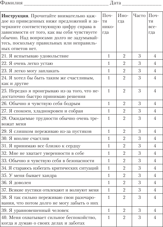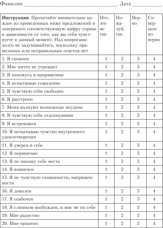 Цель. Данный тест является надежным и информативным источником информации самооценки уровня тревожности в данный момент (реактивная тревожность) и личностной тревожности (как устойчивая характеристика человека). Разработан Ч. Д. Спилбергером (США) и адаптирован Ю. Л. Ханиным.