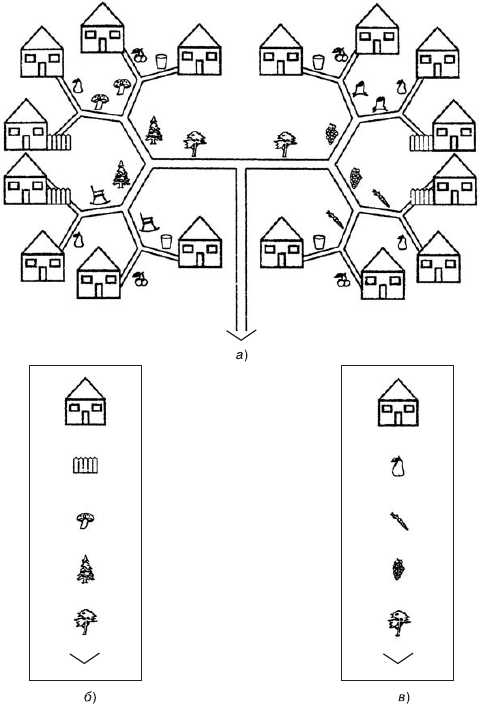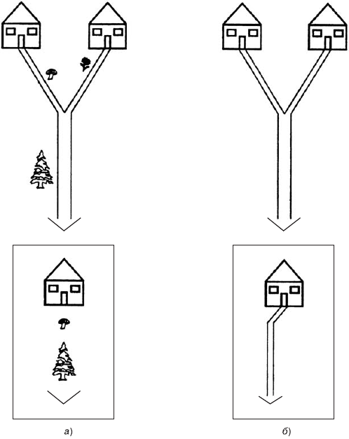 Методический материал: изображение полянок с разветвленными дорожками и домиками на их концах, а также «писем», условно указывающих путь к одному из домиков, помещенных под полянкой (см. иллюстрацию ниже). Вводные задачи состоят из двух задач – задачи «А» и задачи «Б». Решение каждой из задач проверяется экспериментатором. Далее следуют основные задачи. На рисунках к задачам 1–2 изображены только разветвленные дорожки и домики в конце них; на всех остальных каждый участок дорожки помечен ориентиром, причем в задачах 3–4 одинаковые по содержанию ориентиры даны в разной последовательности; в задачах 5–6 каждое разветвление помечено двумя одинаковыми ориентирами. В задачах 7-10 два одинаковых ориентира даны в разных последовательностях и расставлены не на отрезках пути, а в точках разветвления. На «письмах» к задачам 1–2 изображена ломаная линия, показывающая направление пути, по которому должен вестись поиск. В «письмах» к задачам 3–6 в определенной последовательности снизу вверх даны изображения тех предметов, мимо которых надо идти. В «письмах» к задачам 7-10 изображены одновременно и повороты пути (ломаная линия), и необходимые ориентиры.