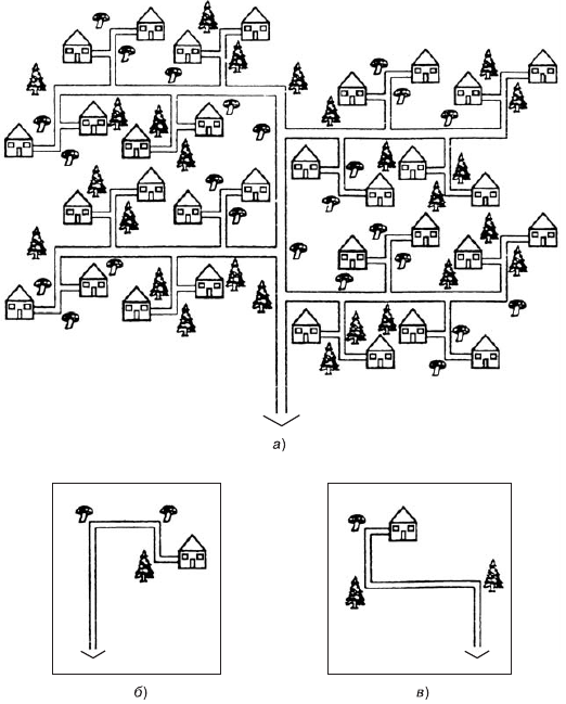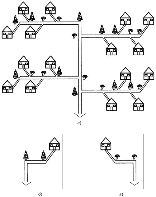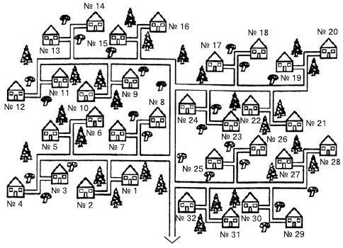 «Перед вами полянка, на ней нарисованы дорожки и домики в конце каждой из них. Нужно правильно найти один домик и зачеркнуть его. Чтобы найти этот домик, надо посмотреть на письмо. (Экспериментатор указывает на нижнюю часть страницы, где оно помещено.) В письме нарисовано, что надо идти мимо травки, мимо елочки, а потом мимо грибка, тогда найдете правильный домик. Найдите этот домик, а я посмотрю, не ошиблись ли вы».