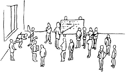 28. Эти люди стоят вокруг стола и один из них что-то объясняет. Ты находишься среди тех, которые слушают. Обозначь, где ты.