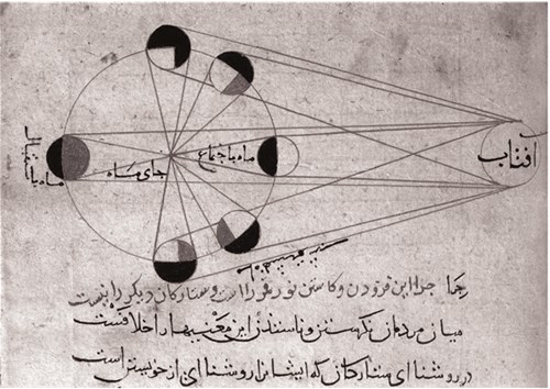 Так, естествоиспытатель аль-Бируни (X в.) измерил плотности различных веществ с помощью изготовленного им прибора и подробно описал свойства более 50 минералов, руд, металлов, сплавов. 45 сочинений он посвятил астрономии. Аль-Бируни рассмотрел гипотезу о движении Земли вокруг Солнца, объяснил фазы Луны (рис. 1.5). В ходе астрономических наблюдений он установил угол наклона эклиптики к экватору, рассчитал радиус Земли, описал изменение окраски Луны при лунных затмениях и солнечную корону при солнечных затмениях.