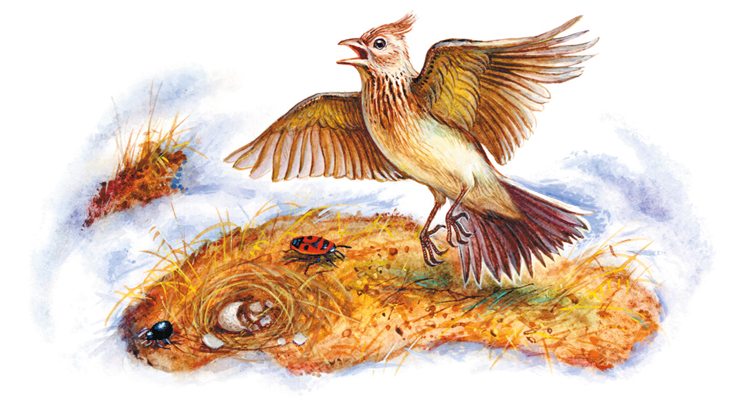 – А я родился на ней! – пискнул Жаворонок. – Если поискать, так тут ещё и скорлупки от яичка, из которого я вылупился, можно найти! Вспомню, бывало, зимой на чужбине гнездо родное – и петь неохота. А сейчас песня так и рвётся из клюва – даже язык дрожит.