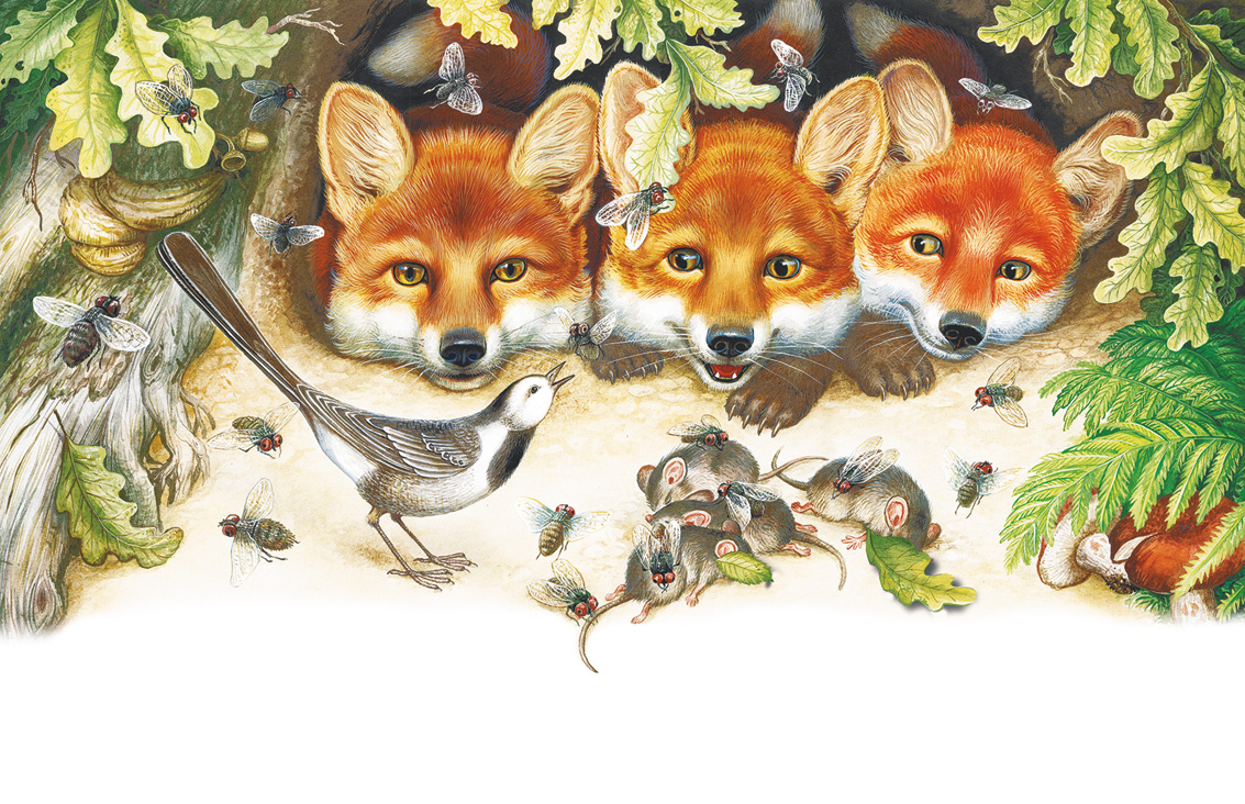 Притащила лиса лисятам мышек на обед. А лисята сыты – давай с мышами играть. Двое одну мышь схватили – тянут-потянут. А один сразу трёх мышей в пастишку – хап! Только хвостики висят.