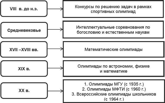 Интеллектуальные соревнования известны в истории с давних пор. Широкое распространение получили математические турниры в Италии в эпоху Раннего Возрождения. С ними тесно связано имя выдающегося математика европейского средневековья Леонардо Фибоначчи. В драматичной истории решения алгебраических уравнений 3-го и 4-го порядков (XIV век) большое место занимали «математические турниры». Причем, необходимо отметить интерес образованной публики к состязаниям подобного рода. Из истории известны аналогичные конкурсы, с которыми связан ряд наиболее значимых открытий в области математики. В ΧVII-ΧVIII веках стали завоевывать популярность «соревнования по переписке», в которых участвовали И. Ньютон, Г.В. Лейбниц, И. Бернулли, Л. Эйлер и другие выдающиеся ученые, что привело, в частности, к зарождению и развитию интегрального и вариационного исчисления. В более поздние времена регулярно проводились всемирные конкурсы на приз Французской Академии Наук (известна победа в таком конкурсе известного российского математика – С.В. Ковалевской). Такие соревнования, как конкурсные экзамены в «Большие школы» Франции, например, в Политехническую и Нормальную, а также знаменитые Кэмбриджские математические экзамены, где главной целью участников являлось получение высокой оценки, также являются, по существу, олимпиадами. Одной из первых предметных олимпиад – прообраза современных массовых соревнований школьников – можно считать Этвешское соревнование в Венгрии в 1896 году.
