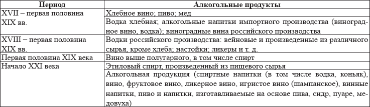 Виды основных алкогольных продуктов и напитков, производство и оборот которых регулировался государством в XVII – первой половине XIX вв., и в начале XXI века