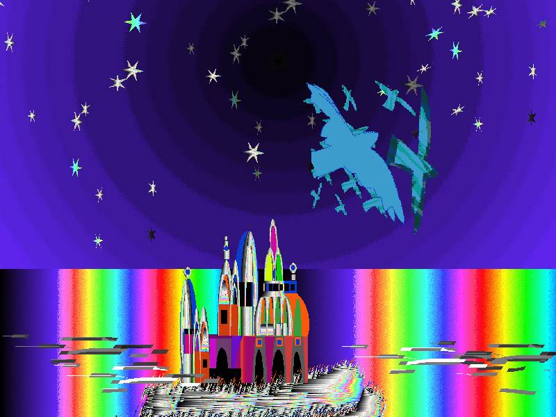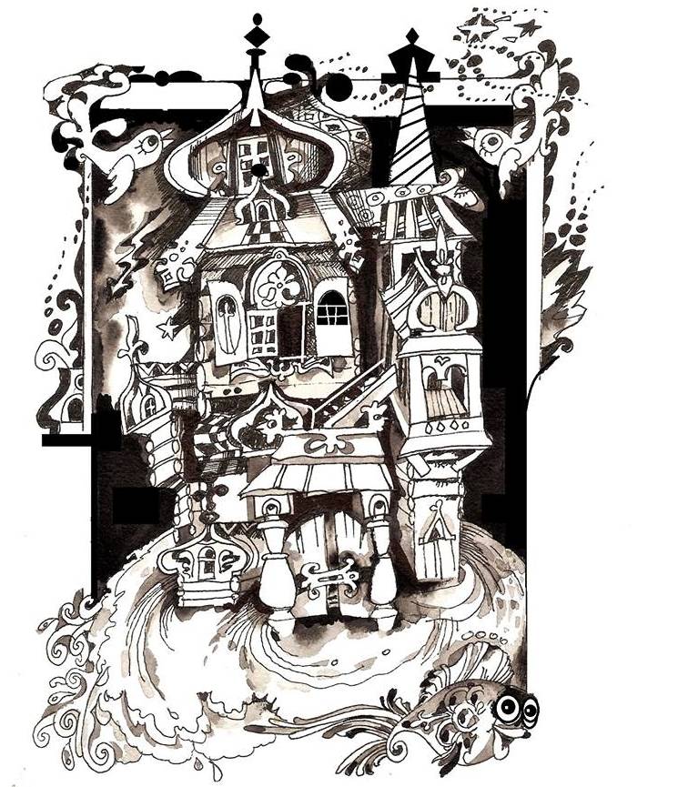 Темный лес озарило заревом. Стало вокруг ослепительно светло. А свет тот, точно ручеек струился из-под елки, что между мной и тем мужичком стояла. И прямо на глазах, как гриб из-под елки, стал расти сначала маленький, как игрушечный, теремок, всеми цветами переливающийся. Пока смотрели-дивились мы на него – он ростом с дом стал. Но и на этом не остановился, – растет выше леса, сверкает. То красным цветом переливается, то еще каким —не уследишь. Да и сам теремок затейливый такой – то шатры золотые, то маковки лёгонькие. И ворота, и всё вокруг было украшено золотыми с колокольцами, которые на удивление ладно вызванивали ту самую песенку, которую напевал, а вернее, хрипел нечаянный попутчик моего деда Ивана. Только этому чуду подивились, а уже другое на глазах твориться стало. Прямо из-под ног ручеек разлился. Сначала маленький такой, едва из-под земли пробился. Стал расти, расти. И вдруг оказались мы рядом с золотым теремом. Жмёмся к нему, а вокруг озеро, на сколько глазу видно. Оно, раскинулось, да так широко, что краев, берегов того озера не видно.