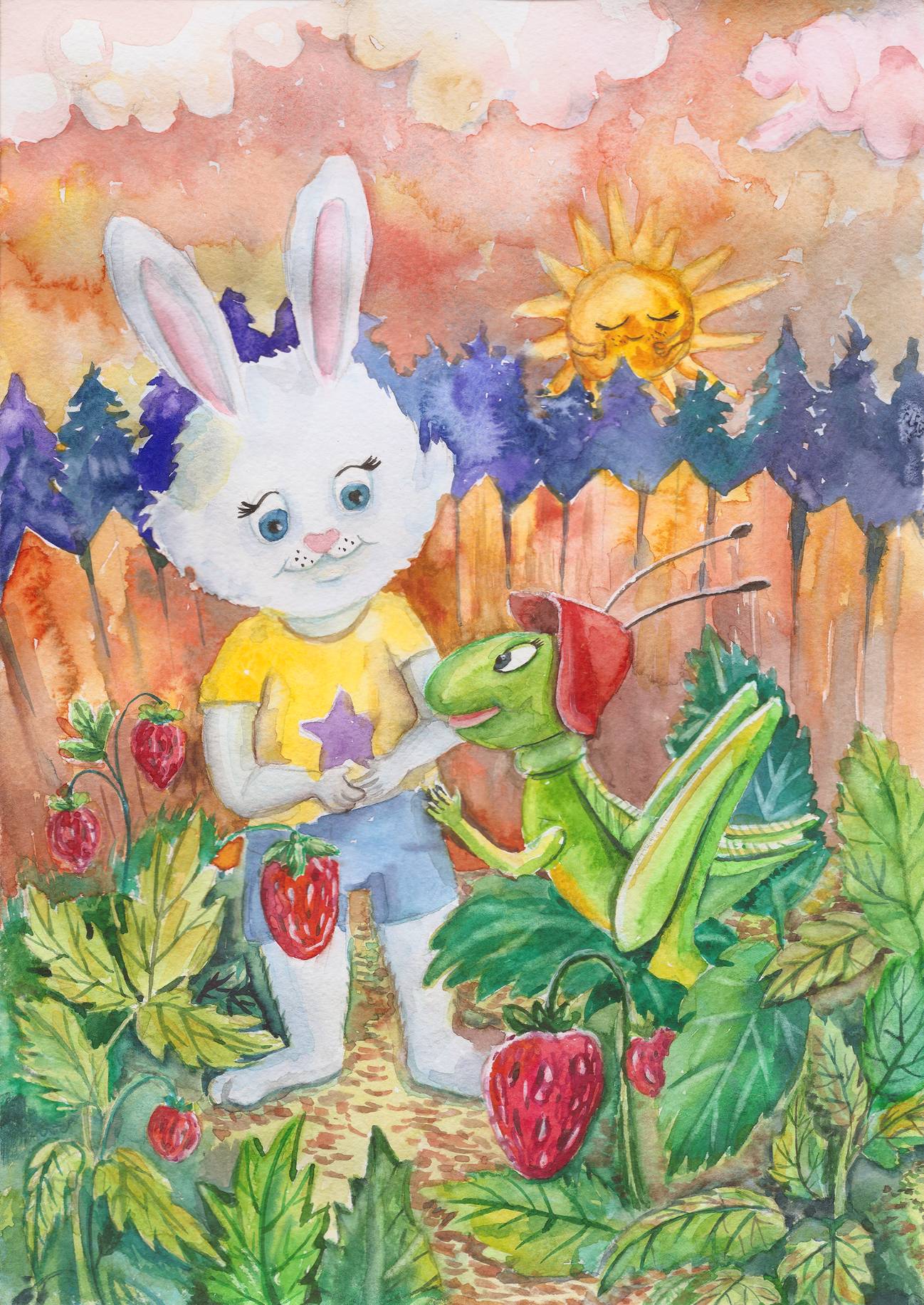 Маленький любопытный Зайчонок стоял на лужайке и задумчиво смотрел на заходящее солнышко.