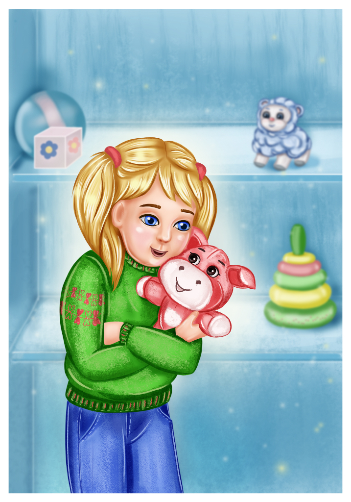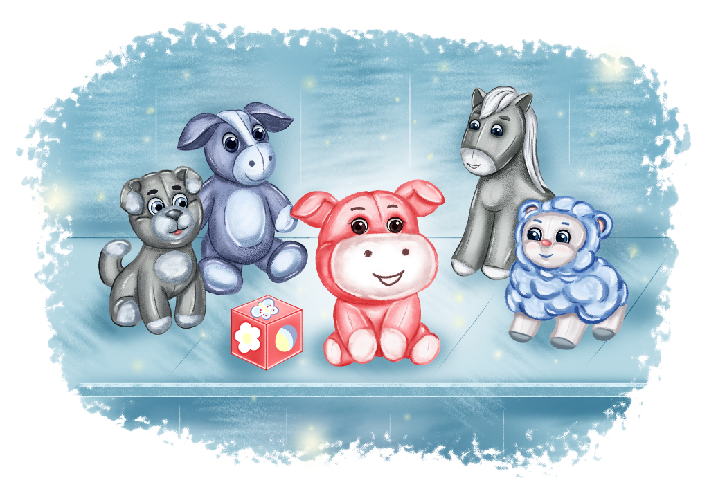 Это был самый обычный магазин. И самая обыкновенная полка. Но только сегодня на этой полке происходило что-то совсем удивительное. Магазин-то был продуктовый, но на днях в него завезли целую партию плюшевых игрушек. Среди них были овечки, собачки, ослики, лошадки и поросята. Все игрушки были как на подбор: с чистой лоснившейся шкуркой и большими выразительными глазами, которые так и манили к себе покупателей, особенно детей. Но был среди этих зверушек один не совсем обычный поросёнок. Ну, никак у него не получалось усидеть спокойно! Другие игрушки постоянно ему шептали на своём игрушечном языке: