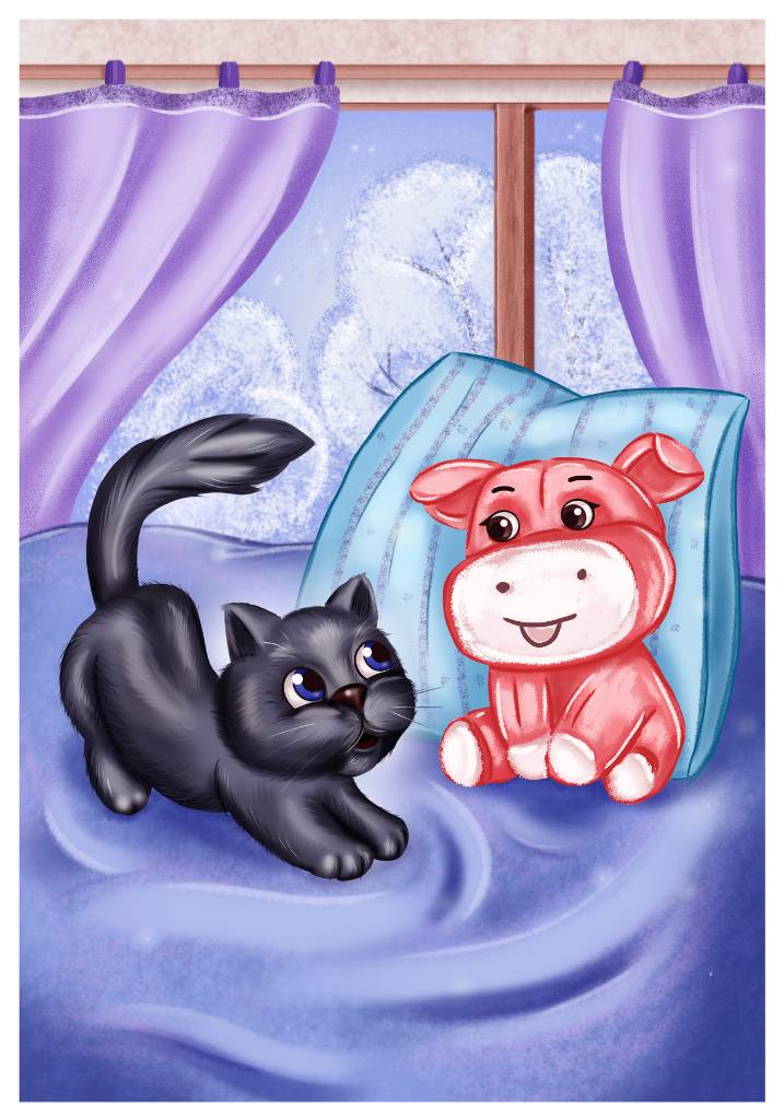 Поросёнок задорно хрюкнул, спрыгнул с постельки и побежал искать чёрного, как уголь, котёнка.