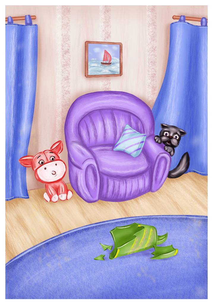 – Ой, нас сейчас будут ругать! Прячься, Малыш! – взвизгнул Хрюмзик и побежал прятаться под кроватью, а котёнок юркнул под кресло.