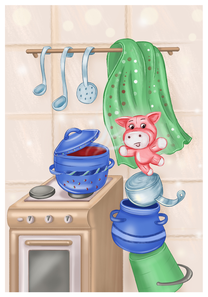 «Ввии! Ввиии!!» – взвизгнул от радости поросёнок, взобравшись на самый верх. Кастрюля с борщом манила его своим ароматом. Хрюмзик зажмурился, посчитал до трёх и… прыгнул на приоткрытую крышку. Но, увы, не удержался и плюхнулся прямо в борщ.