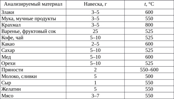 Сухое озоление (термическое разложение, сожжение) наиболее распространено при вскрытии проб органического происхождения в токсикологическом анализе следовых содержаний примесей металлов. Сухое сожжение органических веществ проводят под действием кислорода воздуха или кислорода из баллона. Большинство пищевых продуктов сгорает при температуре от +550°С до +600 °С (таблица 2.5).