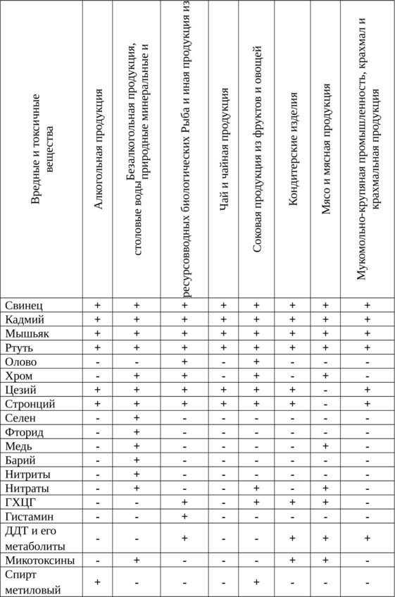Во всех видах продовольственного сырья и пищевых продуктов нормируются токсичные элементы: свинец, мышьяк, кадмий, ртуть. Дополнительно к перечисленным элементам в консервированных продуктах (консервы из мяса мясорастительные; консервы из субпродуктов; консервы птичьи; консервы молочные; консервы и пресервы рыбные; консервы из печени рыб; консервы овощные, фруктовые, ягодные; консервы грибные; соки, нектары, напитки, концентраты овощные, фруктовые, ягодные в сборной жестяной или хромированной таре) нормируется олово и хром. Информация об анализируемых вредных и токсичных веществах приведена в таблице 2.2.