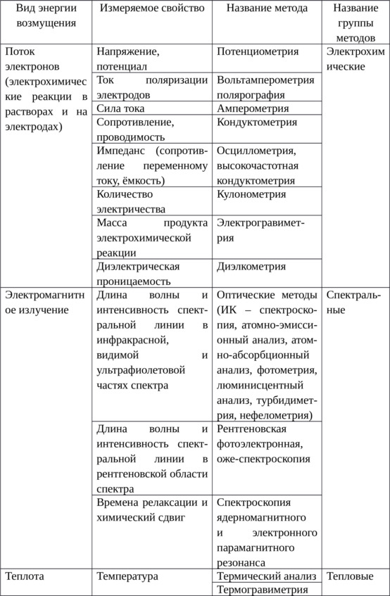 По виду энергии возмущения и измеряемого свойства (аналитического сигнала) физико-химические методы анализа можно классифицировать следующим образом (табл. 2.4.).
