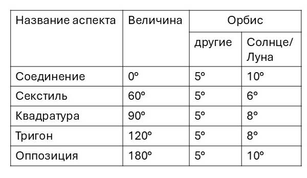 Очень важный фактор, который необходимо учитывать, когда мы говорим об аспектах, – это орбисы. Орбис – это допустимое расстояние в градусах, в пределах которого две планеты могут образовать действующий аспект в натальной карте.