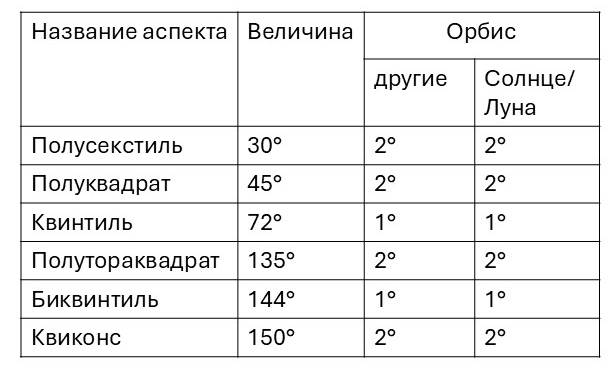 Минорные аспекты еще называют скрытыми или второстепенными, они получены путем разделения мажорных аспектов.