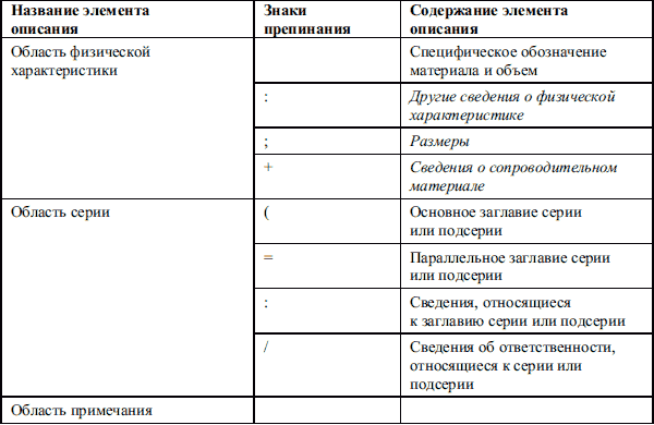 Одноуровневое библиографическое описание состоит из перечисленных в табл. 1.1 областей, представленных в такой же последовательности, с использованием указанных в таблице знаков препинания. Факультативные элементы выделены курсивом.