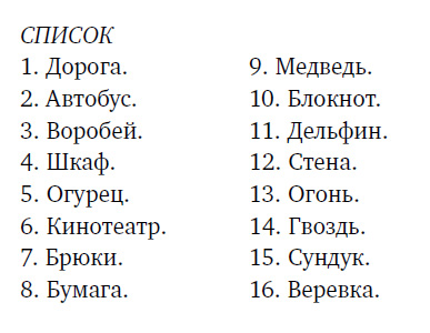Проверочные заданияЗадание 1. За полторы минуты постарайтесь запомнить следующий СПИСОК, состоящий из 16 позиций. В данном задании крайне важно соблюдать нумерацию. То есть при воспроизведении этого списка на соответствующей странице в разделе «Ответы на проверочные задания» вы должны будете под номером 1 написать слово «дорога», под номером 2 – «автобус», слово «воробей» должно следовать под номером 3 и т. д.