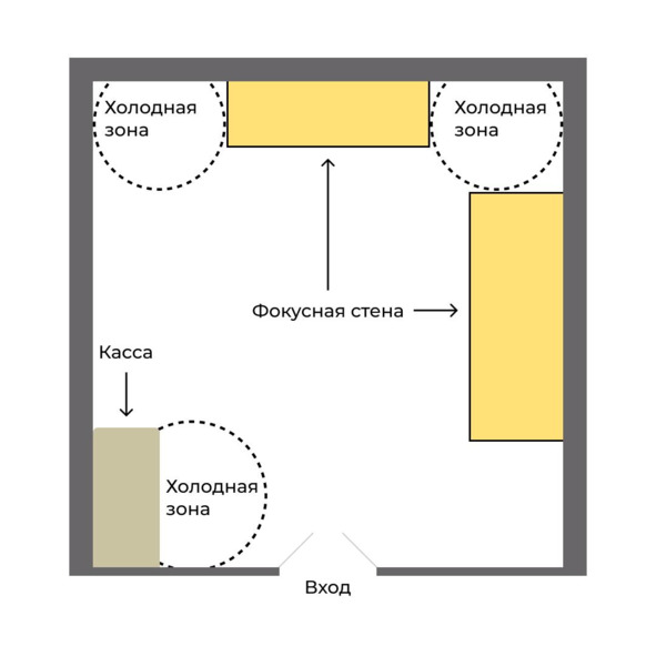 Левый угол от входа в магазин – это холодная зона, куда не доходит покупатель, поэтому разместить там кассу самое правильное решение – на кассу покупатель идет по необходимости.